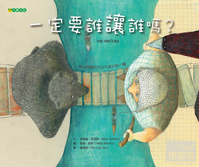 因為這樣的插畫方式,我也用了類似倒敍的方式講給謙謙聽,在講完整個故事後,我拉了小椅子跟謙謙一起站上去,假裝她是大熊我是巨人,摔了好幾次才成功的過橋。之後再從中間那一頁往前推,讓謙謙找一找主角及配角們的位置轉變,然後再跳到最後一頁看看最後大家在哪裏,真的是很多元的方式來看這本書吶,你一定要買回來與孩子們一起讀!
