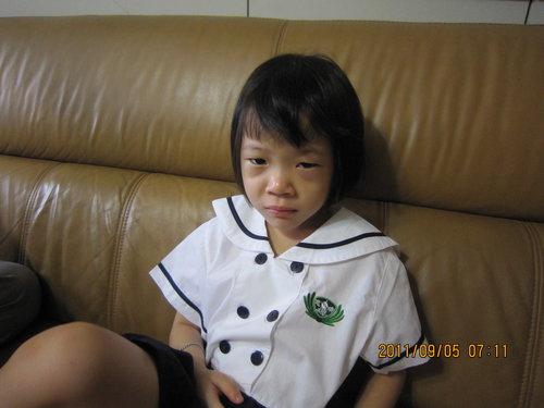 還是哭,真不知是哭哪一條的。我不幫她拿書包跟餐組,今早要出門時,她在灰說餐組太重了,要我幫她拿,我說不要,她又開始哭,後來我說我已經要遲到了,你不要拿餐組,那就丟掉吧!隨手就把餐組丟到垃圾桶,她馬上衝去撿起來,提著就出門了。今早為了穿制服還拗了很久。