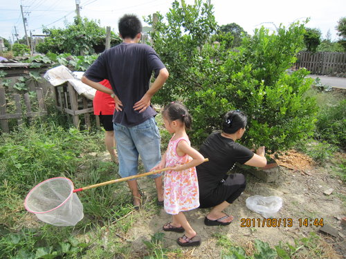 別看那小小的2顆,也是有摘不完的桔子呢!雖然黑肉的菜園裏有數十顆的桔子樹,但蚊子也好多,所以,我不喜歡去餵蚊子,自然的也沒桔子茶可以喝!士哲戈戈看到有蝴蠂,帶著阿謙補蠂去。