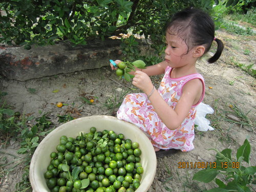 阿謙也有樣學樣,但讓她更有興趣的是剪桔子啦!為了讓她有參與感,大姐姐跟三姨都還讓她待在陰涼處剪桔子,阿謙真的很用心在剪呢!現階段的她,什麼都要幫忙,怕不讓她做會變成不想做或懶得做,所以不管小事大事,也都讓她參與,真的是小幫手。