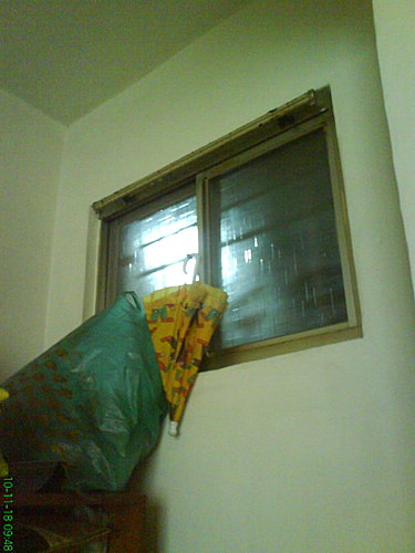 隔天去阿媽家時,快被阿公笑死,因為阿公前一晚一直在家找地方吊那隻小雨傘,本想把它丟掉,阿媽說不可以,後來還想釘釘子吊高一點還想把手把的部份裁掉,最後是吊在窗上。我說,不用啦!拿下來吧!沒有那麼笨的,卡一次還會再卡第二次。