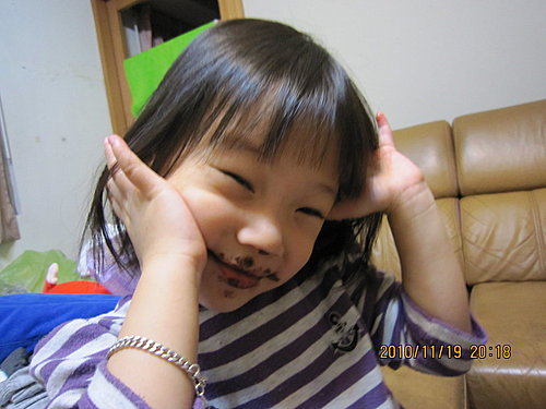 買了一顆巧克力麵包,哪知第一口咬下去就變胎戈囝那~~ 要幫她拍照,還不忘擺姿勢咧!