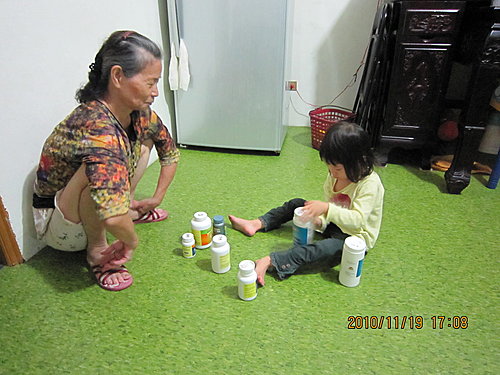 阿媽每天都要吃維他命,阿謙是小幫手,哪個要吃幾顆她都知道,要是快沒了還會提醒阿媽。有時早上阿媽吃完高血壓的藥,下午阿謙還會再跟她說,要吃高血壓的藥哦!阿媽說,不用啦!一天吃一次就好。