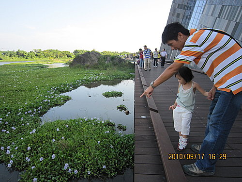 博物館外有溼地,有個小姐姐不小心掉下去了,幸好水很淺,她爸爸馬上衝過去救人。
