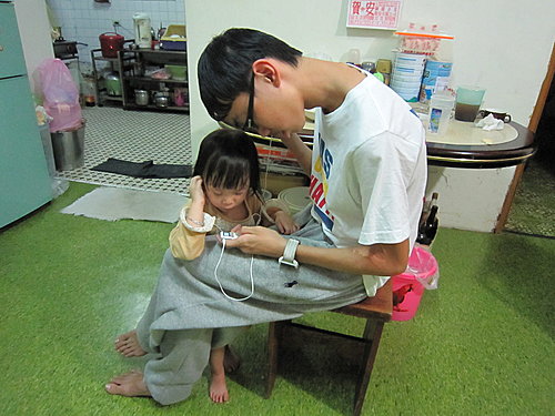 阿里戈戈在聽MP3,阿謙就去湊一卡,很有模有樣的。