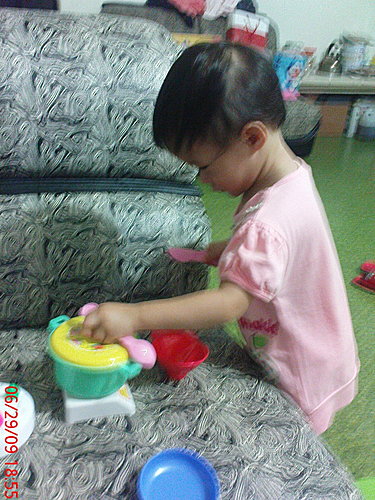 不過,阿謙玩一玩對於裏面送的假食物沒很大的興趣. 倒是喜歡把羊乳片之類的放進去炒一炒後,拿起來吃. 這樣也好也不好. 好是因為可以多吃羊乳片,不好是因為我得常常洗這些玩具. 討厭