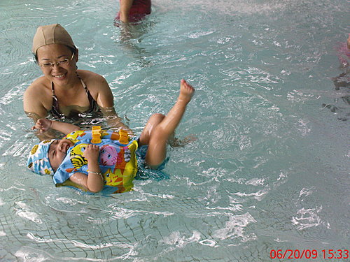 裏面還有温泉池哦,不過有阿謙,我只泡到最不熱的那一池. 快5點準備要離開,在等小比跟蔡荳媽的同時,我們都上岸了,但阿謙還是要一直跳水下去玩. 沒辦法阿媽只好陪她下去. 玩了一陣子上來,她還是又回頭要再跳下水. 這次阿媽就讓她坐在腳上泡水. 超級開心的