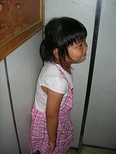 瞧瞧這可愛的肉圓啊 表情透露出很爽的樣子. 只要謙謙一來,她馬上升格當姐姐,多開心的一件事啊 今天來不只是要找她玩啦,順便要接收肉圓啊一件她小時候穿不下的泳衣. 肉圓啊出生時,體重是3930克. 天啊! 這個數字是好幾個月大的阿謙才有的. 整整大了阿謙1500克. 不過,人家可不是只多重量而已哦,身高也很高的. 看她的樣子,別以為已經小學了,實歲才5歲吔! 每一件她留給阿謙的衣服,我總是拿起來看啊看,然後又收起來. 哈哈哈! 她1歲穿的,阿謙要等到2歲啦.