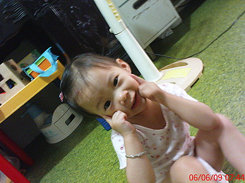 前2天買了這雙鞋子給她,每天到阿媽家脫下涼鞋之後,就換上這雙有免子跟草莓圖案的布鞋,在家裏蹦蹦跳跳的. 阿媽粉受不了,一直叫她阿9(台語),要她不要再跳了,不要穿了. 因為夏天穿包鞋很熱,流到滿頭大汗不說,還流"卡惜"(腳汗). 直說要把鞋子藏起來~