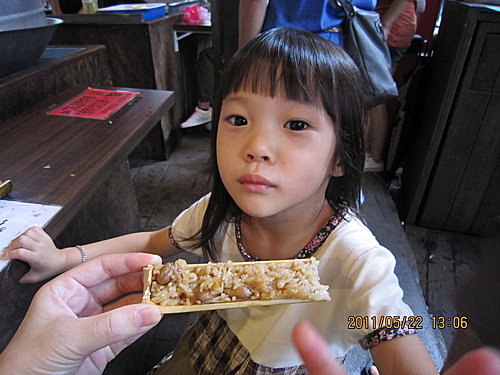 我喜歡不要為了玩而起了個大早,自在出發,精神也會好一些,可是黑肉喜歡早早出門,幸好這次因為有事,所以不用那麼早起,精神多好呀!原以為到溪頭已過中午,但想不到還沒12點就到了。開心的check in,領到妖怪村的折價券準備好好的吃一餐,可是,走過來走過去,每一家都滿滿的人,於是先吃竹筒飯,3支短短的,也要100兩呀!