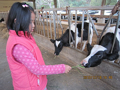 阿J帶我們去禾家牧場餵小牛吃牧草,黑肉說,花錢幫人家養小牛啦!重點是阿謙這個俗啦!看就機機叫了,哪敢餵啊!慈慈姐姐分了一小把給阿謙,可是都我餵的,阿謙到最後也有點心動,給她牧草餵,但她是用丟的。我說小姐啊小牛是沒辦法接到的好嗎?