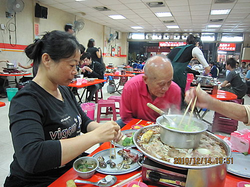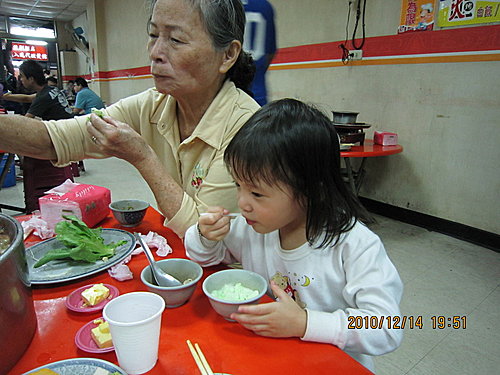 阿公跟我一樣都是恐龍一族的,所以這一餐吃了1個多小時,他都沒有離座,吃的好開心,阿媽在一旁唸肉吃那麼多不好,唸個不停,幸好有三姨出來解圍,叫阿公多吃點菜幫助消化。三姨來之後,我已經吃快飽了,往牆上一看,天啊!還沒一個小時吔!可是我深深覺得自己吃了快2小時,因為嘴巴一直沒停過。