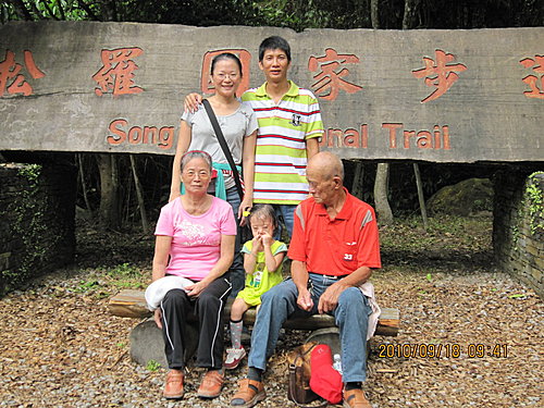 大家都走的很快,只有我們這老弱婦儒,原想在這跟大媽,阿伯,二媽及二媽的媽媽一起拍個合照的,出去玩那麼多次了,都沒拍到團體照,真是可惜!但他們腳程太快,所以我們自己拍囉!看看阿謙又在扮鬼臉,阿公看她沒看鏡頭。