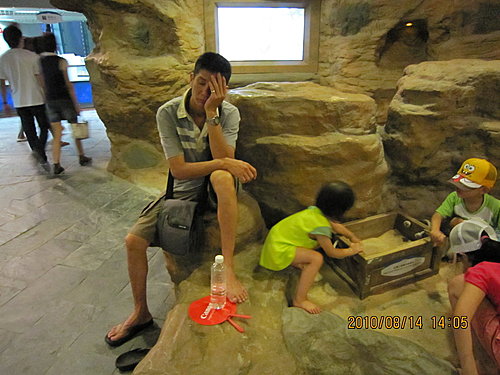 因為才剛進來,所以在這一區停留很久,可能是假日又是暑假快結束了,所以人也蠻多的。我們到了可以摸海星這一區時,發現要卡位很難,又怕阿謙不敢摸。不過,正好有人離開,所以黑肉就帶阿謙看看什麼是海星跟海參。