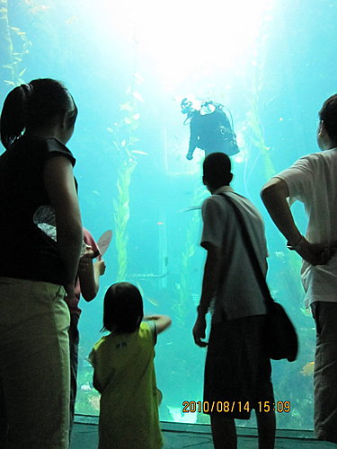 不知道為什麼,每次來這,都有潛水員在清水池,這潛水員一手用吸盤吸住玻璃,另一手拿刮刀在刮玻璃上的青苔,動作看起來像是在叫人過去一樣,阿謙看的得入神,還一直跟他揮手。