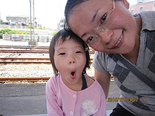 被挖起來的阿謙,眼神還有點散漫,哈哈哈~幸好有火車,可以提一下她的精神!一起拍張照吧!我的寶貝~