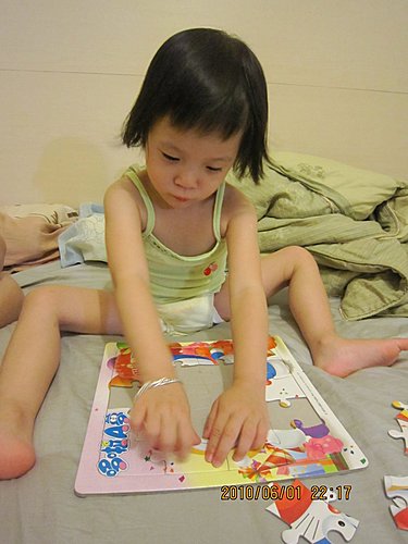 阿謙閉著嘴嗯嗯的回答,我又再問一次,還是閉嘴嗯嗯的說話,我想。。。不妙,趕快爬起來開燈,一看,原來是吐出來了,含在嘴裏啦!真是棒的小孩!