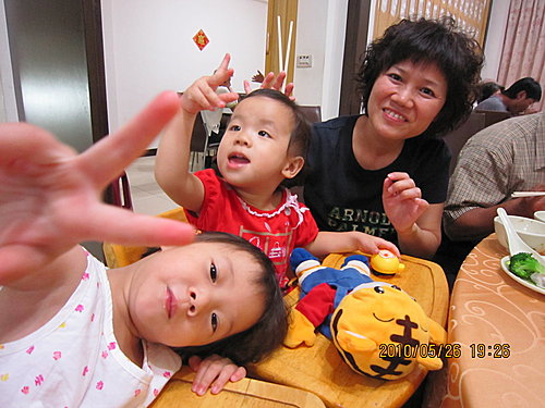 去的時候其實已經開桌了,菜已上了幾道,看到那麼多小朋友,阿謙很難安份的坐著,幸好大姑姑的女兒葉佐一直來她旁邊晃,所以我就跟她說,快點吃給葉佐看。有小孩伴,真的吃比較多,大姑姑也如法泡製,所以拉了兒童座椅來一起吃。