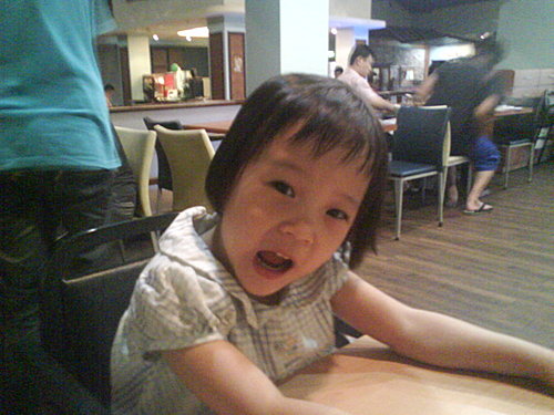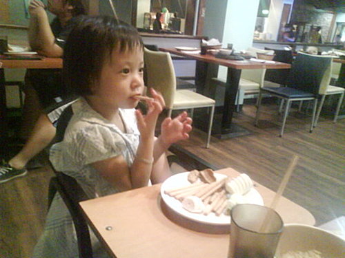 這間我家牛排有巧克力噴泉,一看到這個,心情就好了,因為肯定有我跟阿謙愛的棒狀餅干。哈哈哈~瞧阿謙吃的多努力啊,連那隻腳都給我擺上椅子了,一看就是阿公阿媽帶的小孩。