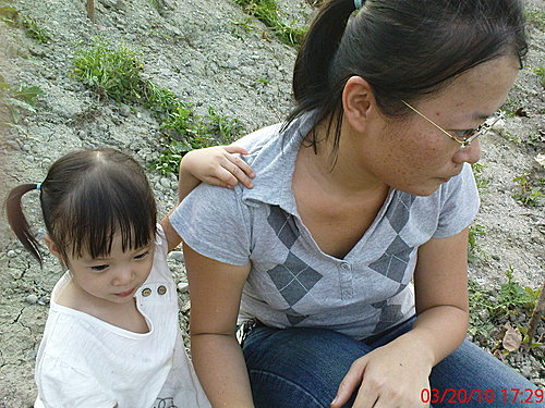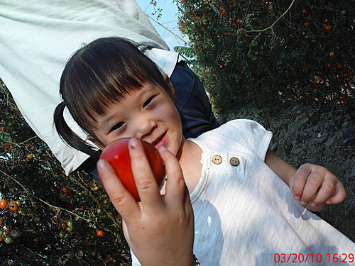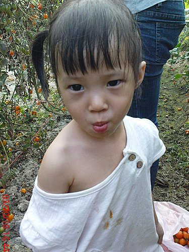 阿謙一開始時很認真在採哦!而且有教她,要紅一點的,所以她會抓起來,認真的看一下再拔。小幫手的她還會幫忙提袋子。不過,到最後,就不採,只想吃跟提袋子,更可愛的是,還去挖大姐姐的拿來放在我的袋子,實在是聰明的小孩。