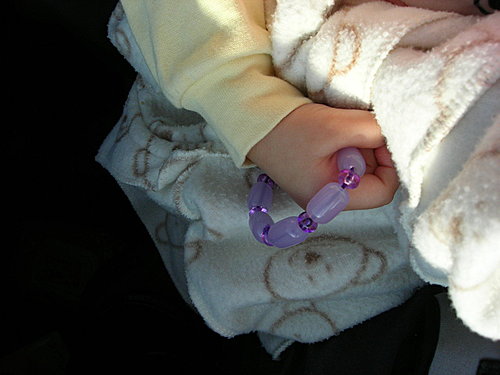 在車上看到這串粉紫手錬,馬上拿著戴著,並一直強調「這是我的!」