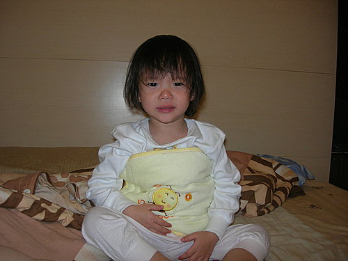 昨晚黑肉跟我陪阿謙進去睡. 阿謙又是一陣翻滾後,突然背對著我們安靜下來. 我心想,太讚了,要睡了. 於是拿起被子幫她蓋. 結果她竟然推開還說: