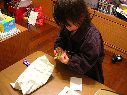 今天一早有點賴床,於是跟她說,聖誕老蹦蹦有送禮物給你哦! (為什麼是老蹦蹦呢? 因為阿謙不會發"公"這個音,每次叫阿公都是阿蹦. 之前是阿冬. 然後蹦喜蹦喜~) 阿謙開心的準備拆禮物了.