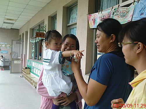 每天11:30去接阿謙時,我都會帶個小點心給她,鼔勵她,因為她真的很棒. 抱她的就是班上的老師之一,小朋友們叫她楊媽媽. 非常感謝兩位老師的用心,因為她們這幾天真的好照顧謙謙. 怎麼我一直覺得要謝謝老師謝不完? 真的是大大的感受到老師們的用心跟愛啦!