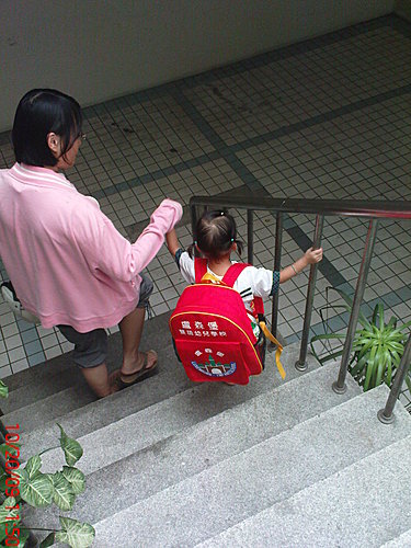 書包雖沒放什麼,但不到10公斤的她背起來感覺就是會倒頭栽. 可是阿謙還是很堅持的自己揹,還要揹水壺呢.