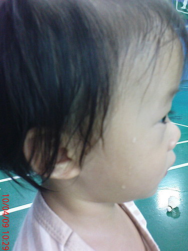 剛到羽球場時還真有點不習慣,因為是室內沒有冷氣. 我們還在吃早餐,但阿謙已是滿頭大汗. 還沒運動吔....真是誇張!