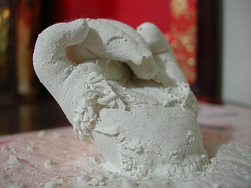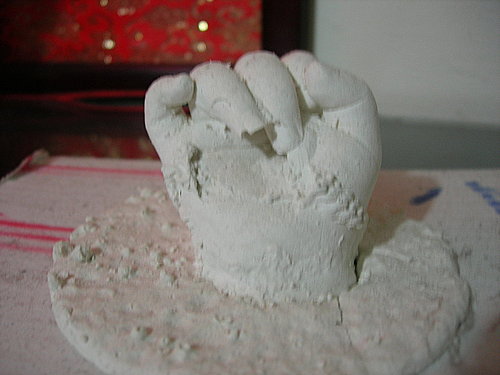 結果......看似簡單的作法,做起來大大的有學問哦! 首先,第一個模的材質跟我們在做假牙的模所用的粉紅色的粉味道一樣,手冊有說第一模的時間要短,因為很快就硬了,可是它也沒說有多快,結果當我用心的攪拌粉和水,覺得均勻了,要把寶貝的手放進去時.......