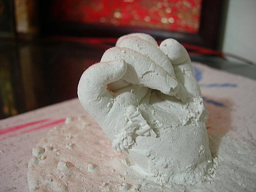 接下來便是調石膏粉要倒入模子裏,不過,看到下面這張照片,我想,你也了解這一道的手續也沒有做的很好了吧! 因為無名指的指頭沒有用到石膏.