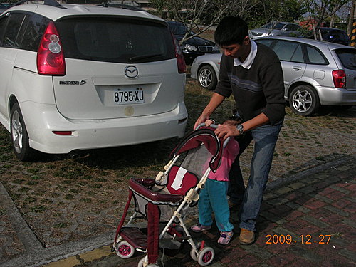 我們一路開到了關仔嶺,才發現其實去關仔嶺還比去四重溪近吔! 那麼以後還是來關仔嶺好了. 車停好了,黑肉想要拿推車,因為......萬一阿謙賴皮不想走,自己才不會那麼累. 只是,阿謙還不想走,也想幫忙推推車時,更累啊!
