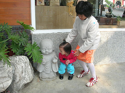車停好,會先經過外面的商家,在商家外面的小草皮上就會看到小僧.粉可愛的小僧哦,阿謙一看到就說,媽媽拍.意思是要我幫她拍照啦!